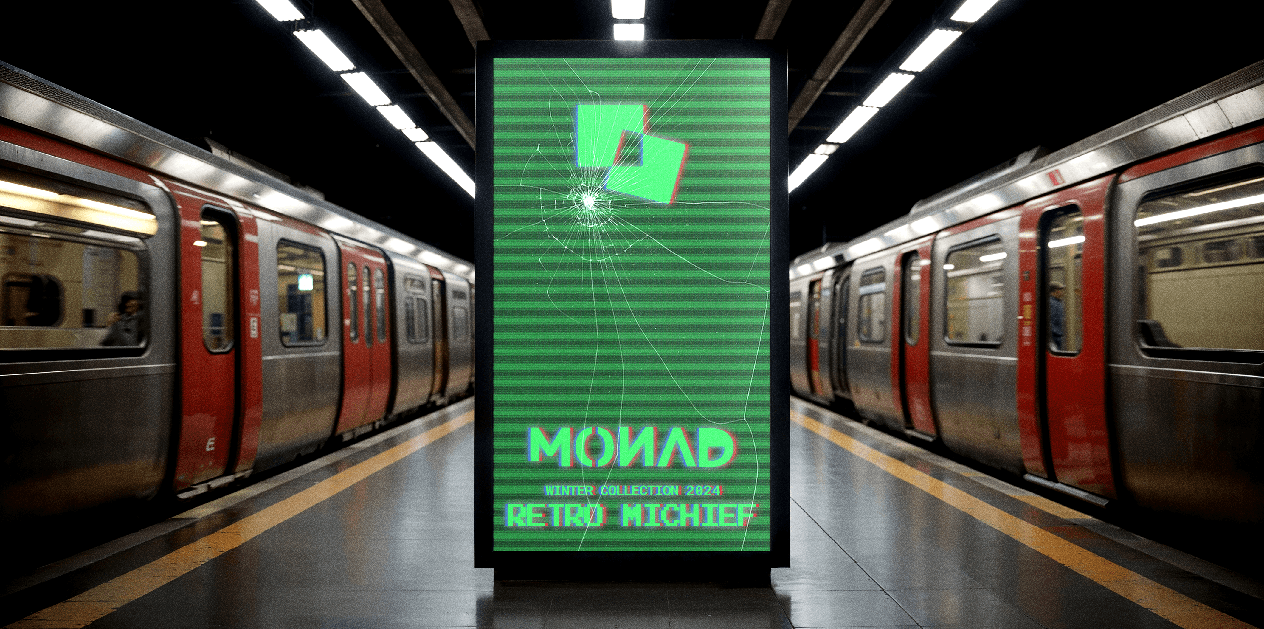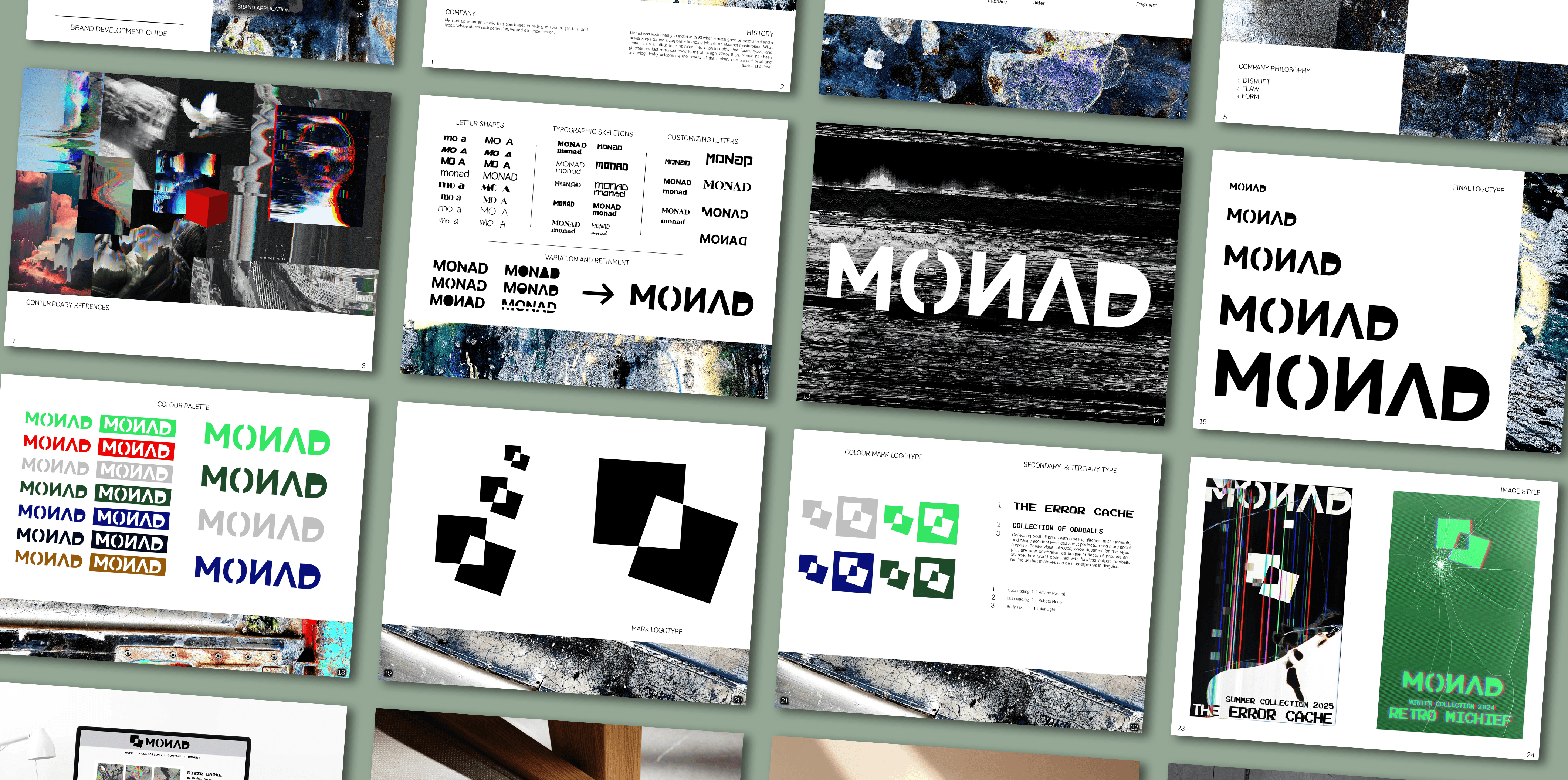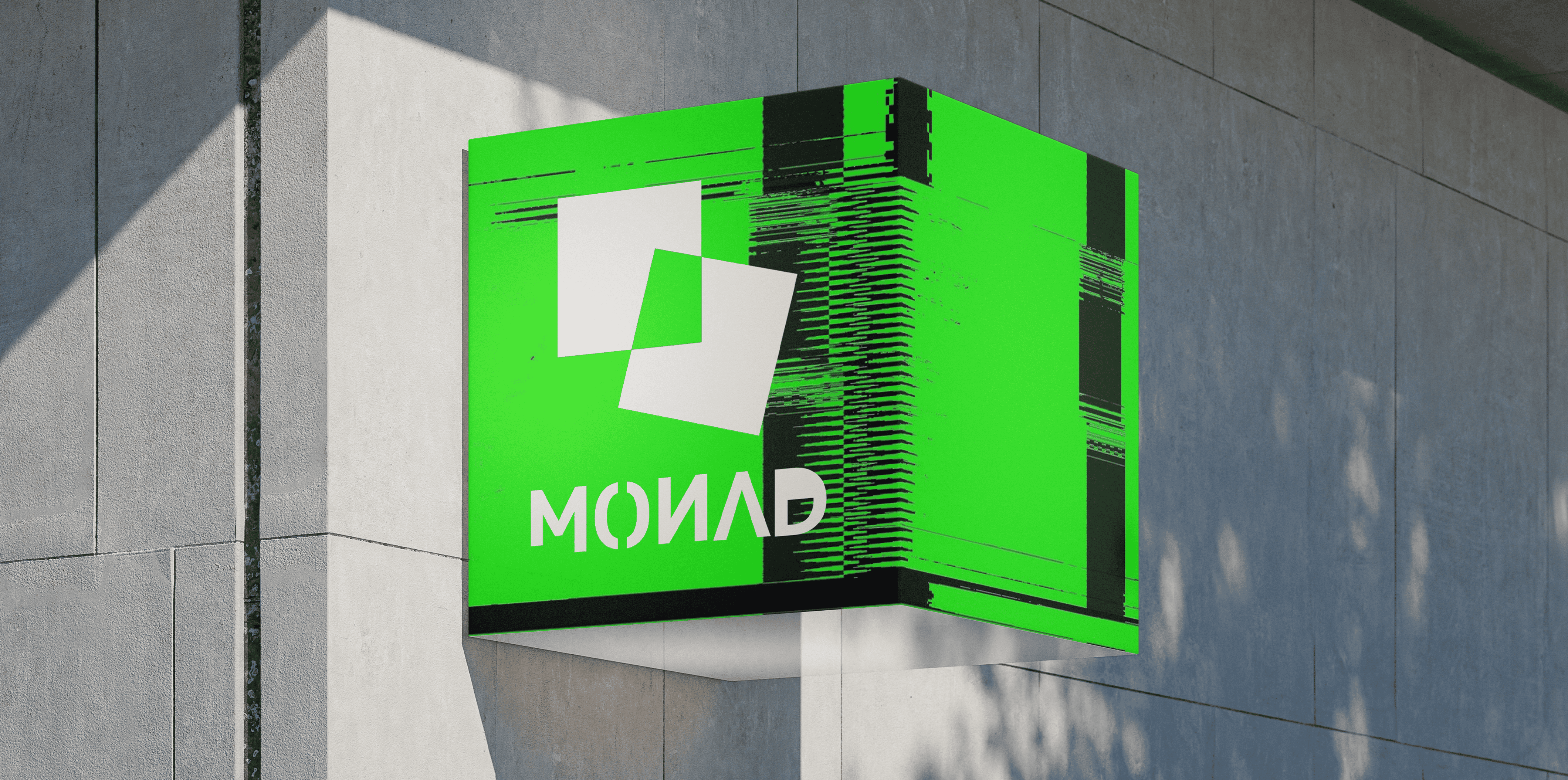 Monad is a conceptual brand identity exploring glitch aesthetics and controlled visual chaos.